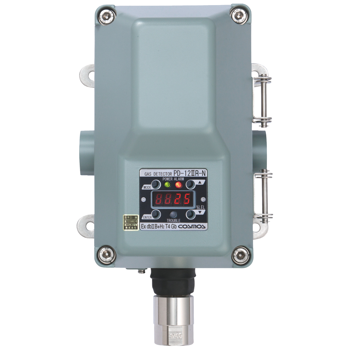 このたび開発した「PD-12IIR」は、NDIR式ガスセンサを搭載した吸引式のメタン用ガス検知部です。NDIR式はガスの赤外線吸収特性を利用して種類と濃度を検出するため、酸素が少ない環境や常時ガス雰囲気下でも安定して検知できます。また、被毒性ガスによる性能低下が少ないため、過酷な環境での長期使用に適しています。吸引式であるため設置場所の自由度が高く、配管や天井の高い現場などでも有効に活用できます。さらにNDIR式の吸引式ガス検知部については、当社ではこれまで非防爆構造品のみの取り扱いでしたが、「PD-12IIR」は初めて防爆構造に対応しました。