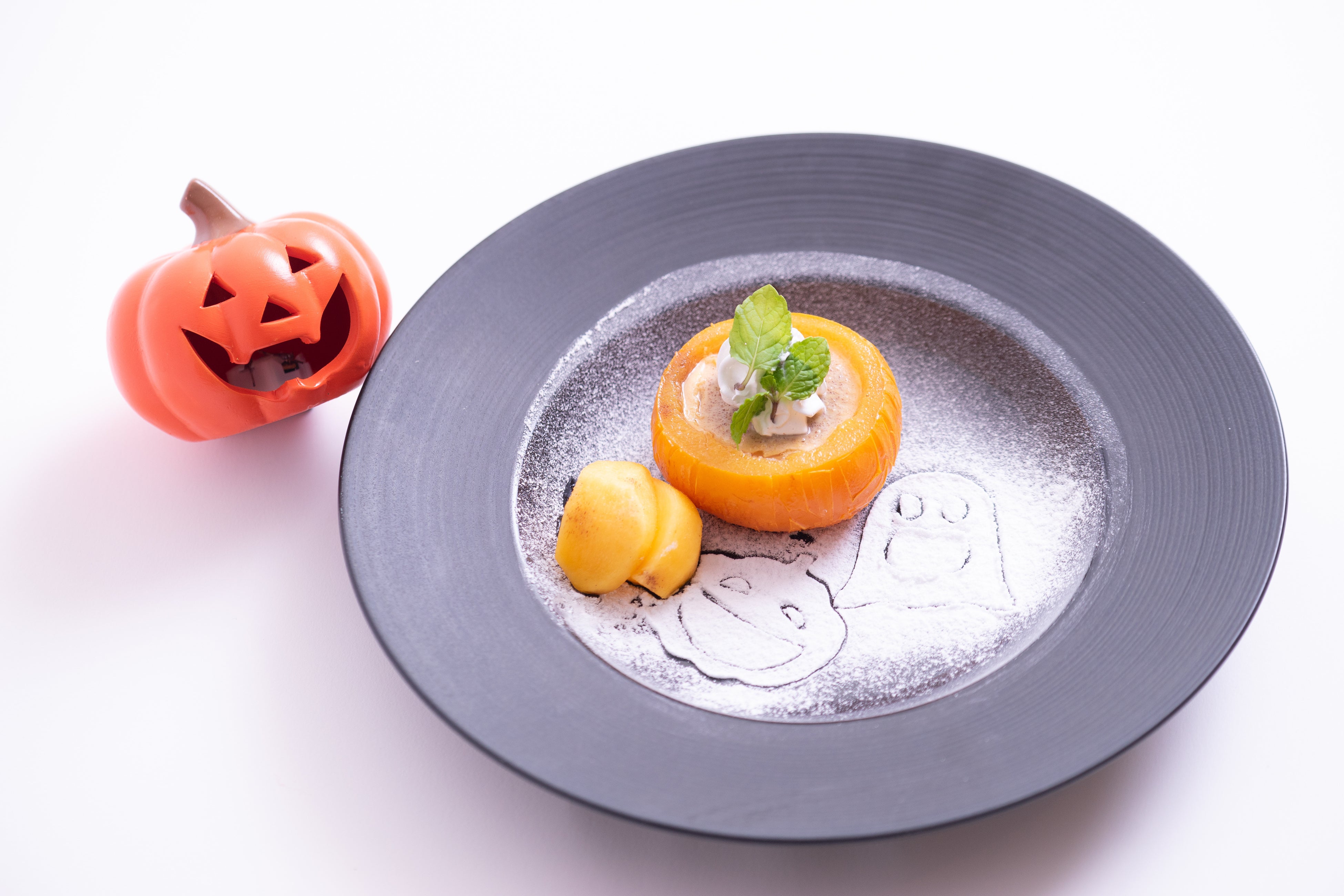 くり抜いた鳥取県産の柿の中に、白バラ牛乳と卵を使用して蒸した自家製プリンが入ったスイーツ。とろとろで風味豊かな柿をご賞味ください。