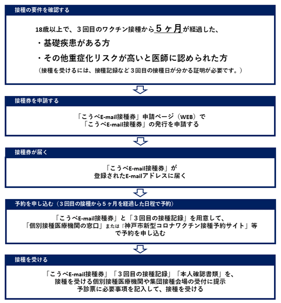 要件に該当する方からの申請により接種券(「こうべE-mail接種券」または「郵送による接種券(紙)」を発行します。申請の受付は、令和4年6月1日(水曜)から開始します。