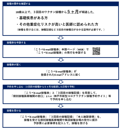 神戸市では、4回目接種の対象となる60歳以上の方に順次、接種券をお送りします。接種をご希望の方は、まずは、かかりつけの診療所・病院にご相談ください。また、18歳以上60歳未満で基礎疾患を有する方やその他重症化リスクが高いと医師が認める方(以下、「60歳未満の基礎疾患を有する方等」と言います。)については、郵送による紙の接種券のほか、申請いただいた後、即時にお手元に届く「こうべE-mail接種券」を新たに導入します。