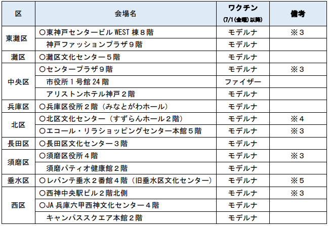 ※3 東神戸センタービルWEST棟8階(東灘区)、センタープラザ9階(中央区)、エコール・リラショッピングセンター本館5階(北区)、須磨区役所4階(須磨区)、西神中央駅ビル2階北側(西区)は、6月30日(木曜)まではファイザー社ワクチンを使用します。(7月1日(金曜)からモデルナ社ワクチンを使用します。)