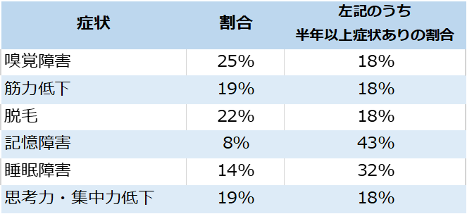 ○「後遺症があった(ある)」と回答されたうち4割以上の方は、記憶障害や睡眠障害、脱毛などの深刻な症状が2カ月以上継続しており、中には6カ月以上継続している方もおられます。