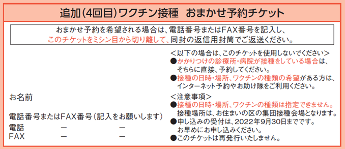 ・「おまかせ予約」をご希望される方は、「おまかせ予約チケット」に印刷されているご自分のお名前を確認の上、連絡先を記入して、接種券から切り取り、返信用封筒(接種券に同封)で神戸市に郵送してください。