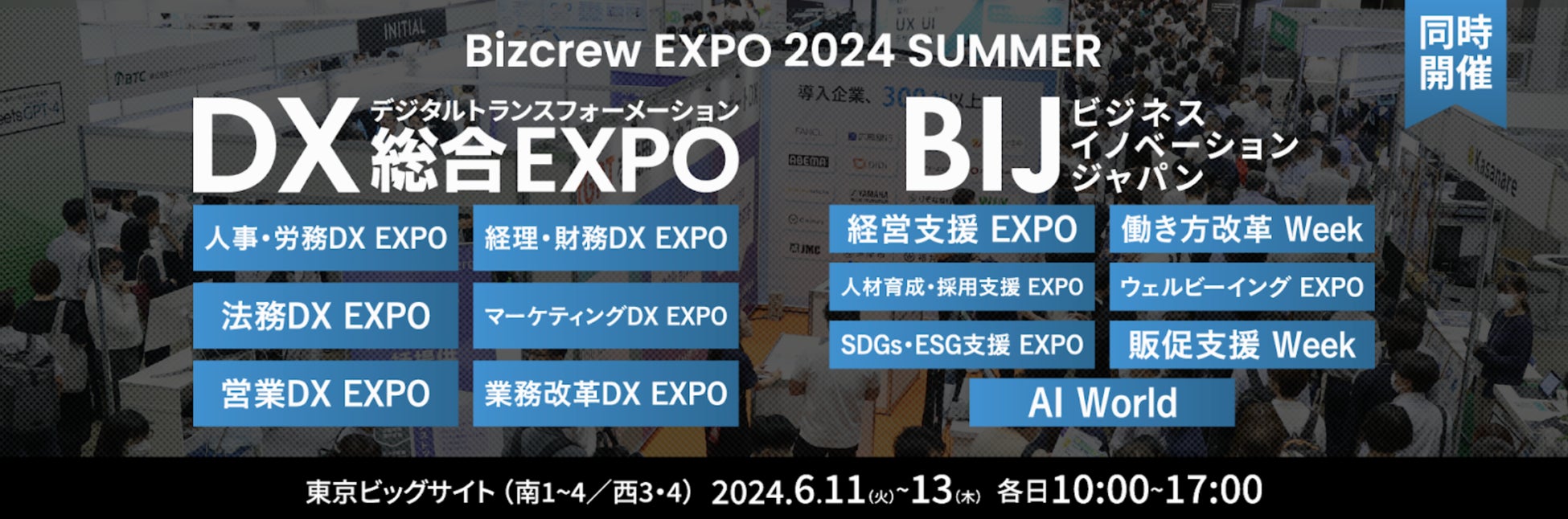 DX 総合EXPO / ビジネスイノベーションJapan 実行委員会は、2024年6月11日(火)~13日(木)までの3日間、東京ビッグサイト(東京都江東区)にて「DX 総合EXPO 2024東京【夏】(以下、DX 総合EXPO)」「ビジネスイノベーションJapan 2024東京【夏】(以下、BIJ)」を開催しました。3日間で24,000名以上の方々にご来場いただき、ビジネス課題解決に役立つ製品やサービスを体験頂いたり、昨今のビジネスを牽引するリーダーの方々のセミナーにご参加頂いたりと、盛況のうちに閉幕いたしました。