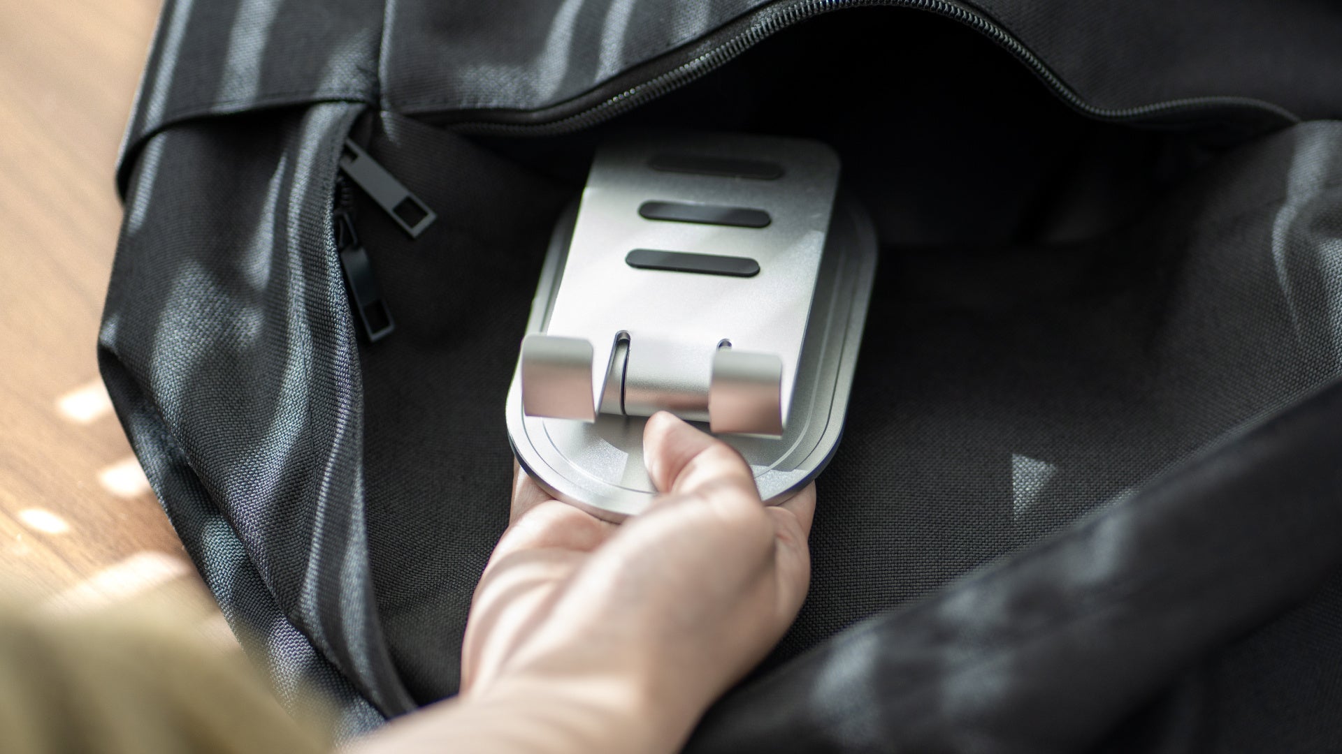 台座を楕円形にすることでよりコンパクトになりました。また折りたたむこともできるのでスマートフォンと一緒の持ち運びにも便利です。