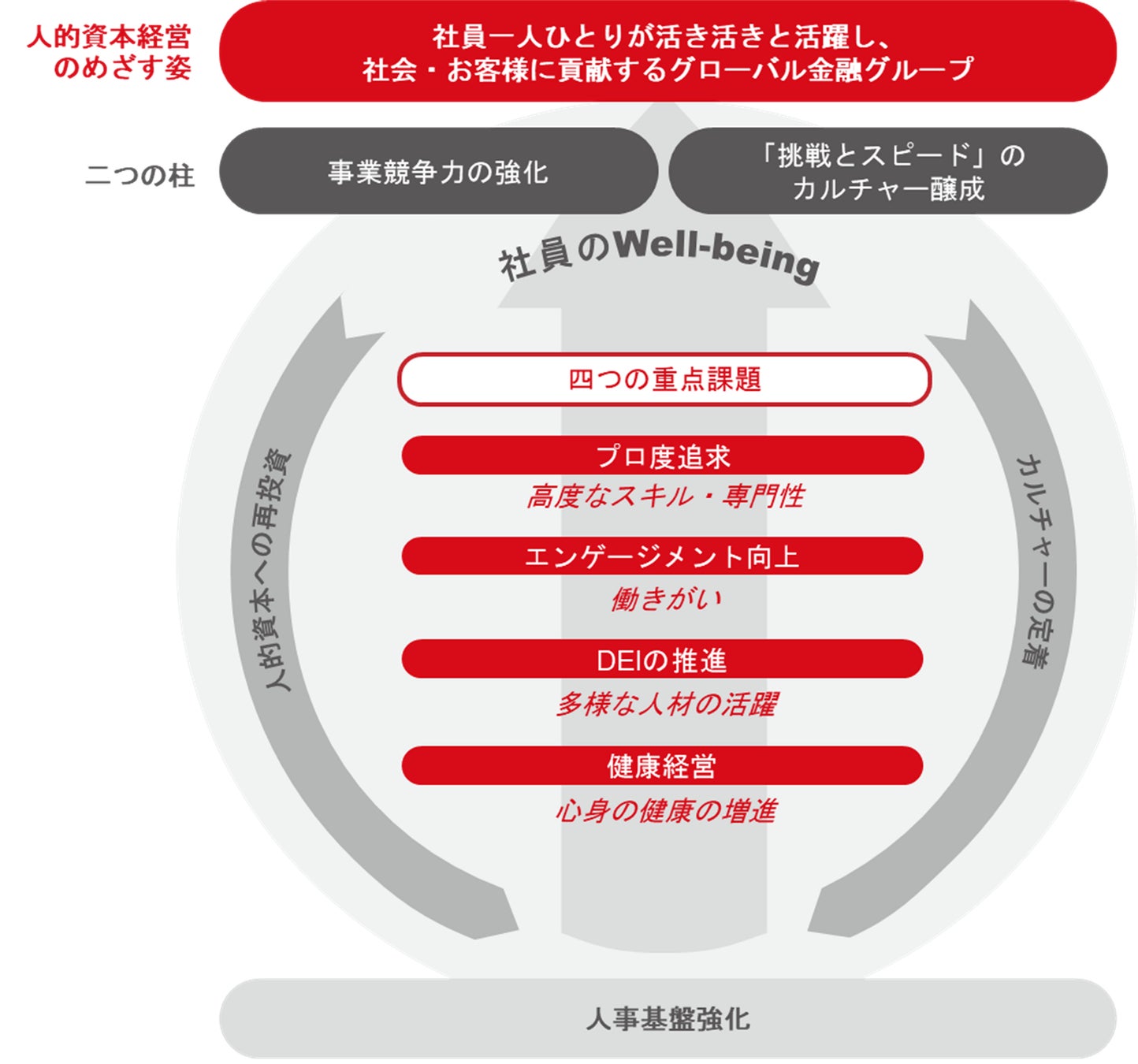 MUFGの人的資本経営では、従業員の活躍の土台となる「健康経営」や「エンゲージメント向上」「プロ度追求」に取り組んでいます。それにより、従業員のウェルビーイング、中長期的な人生の充実を実現し、「事業競争力の強化」、「『挑戦とスピード』のカルチャー醸成」を進め、従業員一人ひとりが活き活きと活躍し、社会・お客さまに貢献するグローバル金融グループとなることをめざしています。