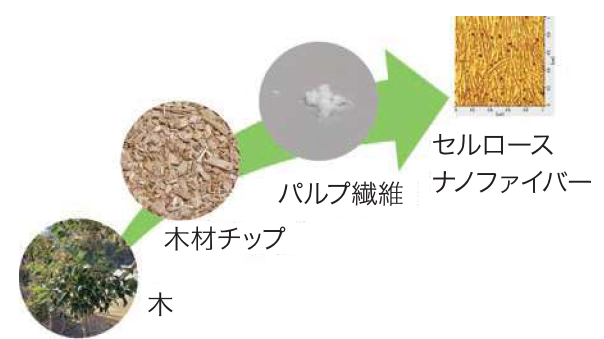 植物由来のセルロースを直径約20nm、長さ数μmにほぐすことで生まれる 最先端のバイオマスナノ繊維素材です。軽量かつ高強度の特性を有して おり、資源の少ない日本をはじめ世界中で、森林資源を生かせる新素材として注目されています。