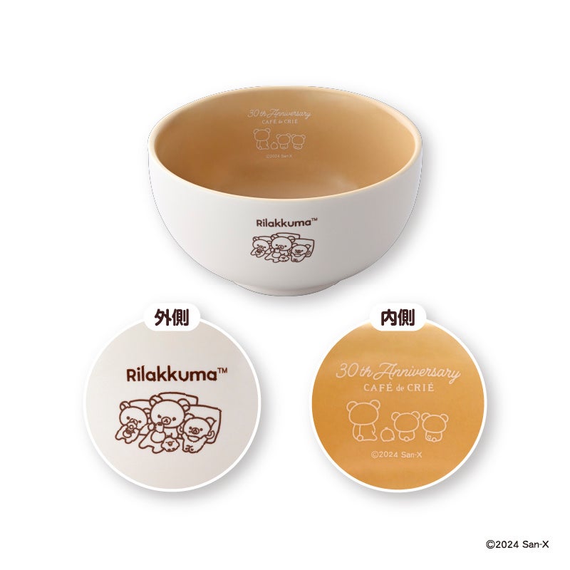「オリジナルスープボウル」は、オリジナルデザインで製作。内側には、”リラックマ”たちの可愛らしい後ろ姿と『カフェ・ド・クリエ』30周年記念の文字を描きました。少し浅めのため、スープの具材をごろっと見せ美味しそうに盛ることができます。さらに、スープだけでなく、サラダや簡単な朝食の盛り付け、お菓子などの小物入れにもぴったりです。