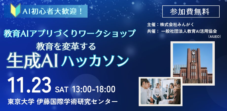 株式会社みんがく(本社:東京都目黒区、代表取締役:佐藤 雄太)は、東京大学・伊藤国際学術研究センターにて、教育AIアプリづくりワークショップ「教育を変革する生成AIハッカソン」を開催いたします。