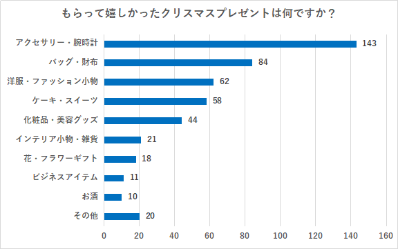 クリスマスにもらって嬉しいものについて伺ったところ、一番多くの票数を集めたのは「アクセサリー・腕時計」でした。