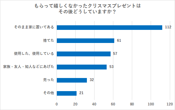 「もらって嬉しくなかったクリスマスプレゼントはその後どうしていますか?」という設問に対して、「そのまま家に置いてある」と回答した方が多い結果となりました。