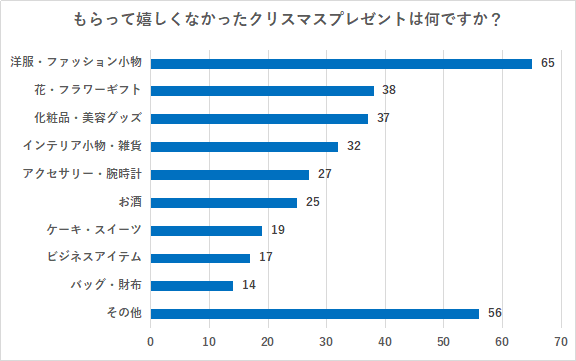 「その他」以外でクリスマスにもらってあまり嬉しくなかったものについて伺ったところ、一番多くの票数を集めたのは「洋服・ファッション小物」でした。