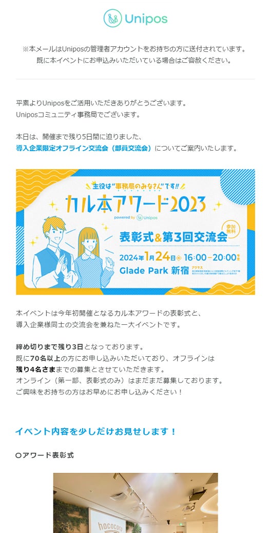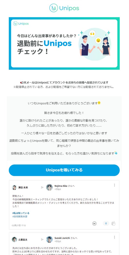 Unipos様は、従業員同士が互いの良い行動を称賛したり、感謝の気持ちを伝えたりする際に少額の報酬(ボーナス)を贈り合うことができるピアボーナス®︎ツール「Unipos」の開発・提供や、組織風土改革のコンサルティングをおこなっています。同社はメール配信システムWEBCAS e-mailを活用し、カスタマーサクセスを目的とした各種メール配信や、オウンドメディアのニュースレター配信に取り組んでいます。