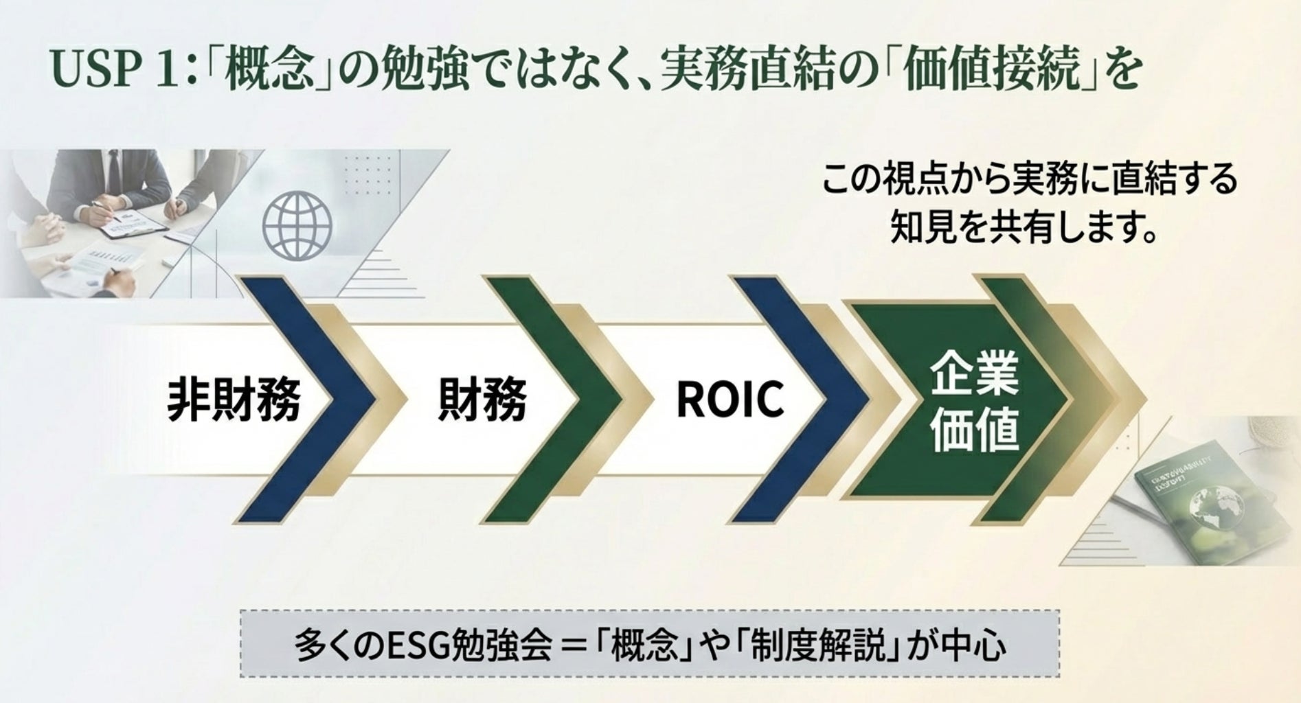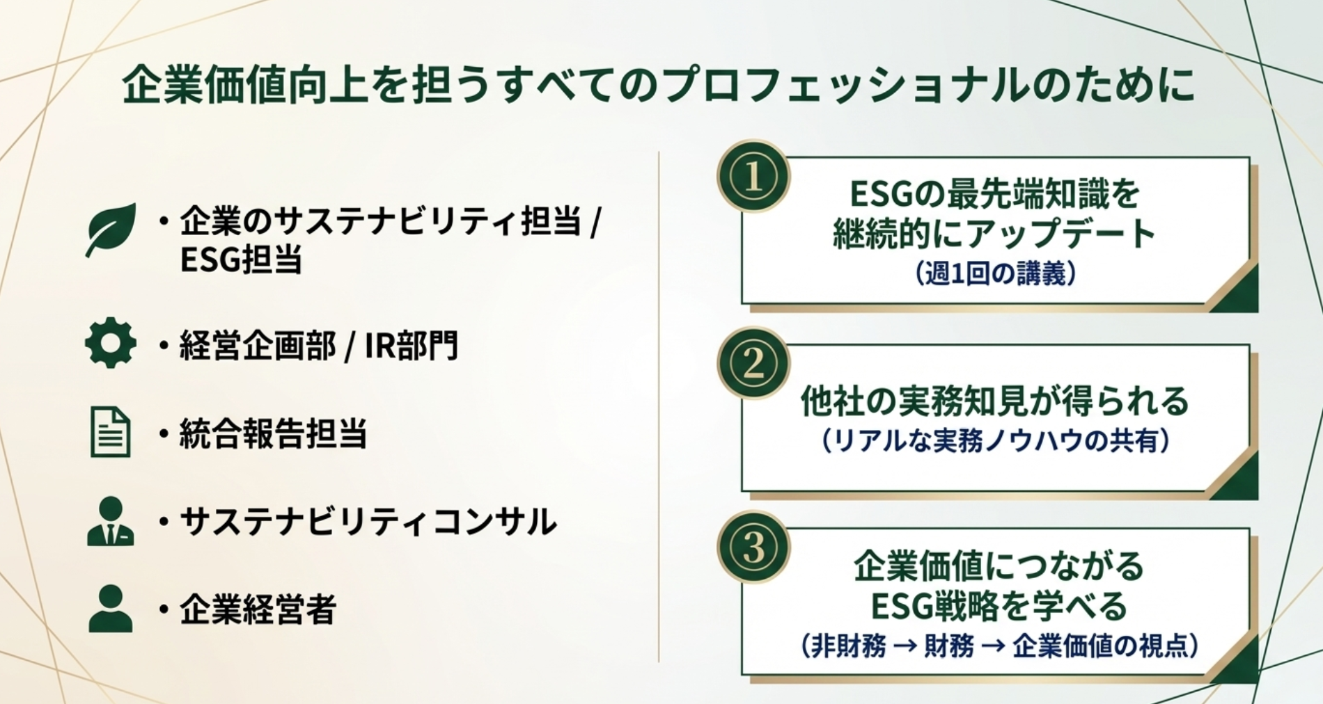 ✔ 企業価値につながるESG戦略を学べる