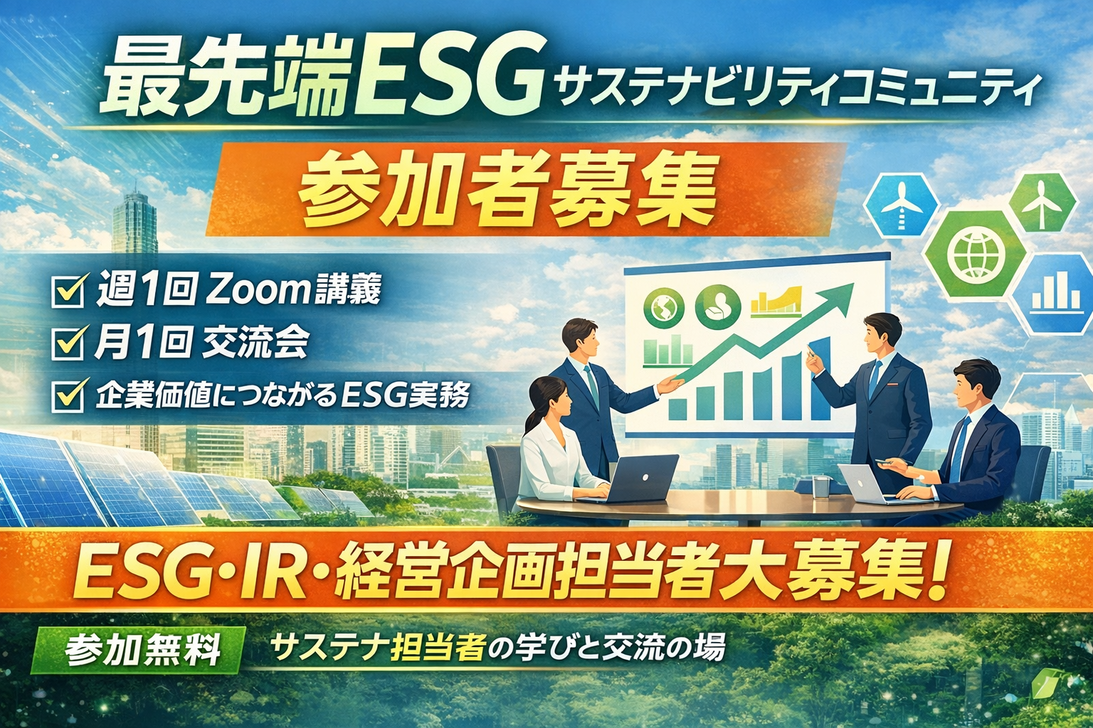 本コミュニティでは、週1回のZoomオンライン講義/月1回の交流会(無料)を通じて、ESG・サステナビリティの最新動向や企業価値につながる実務知見を学びます。