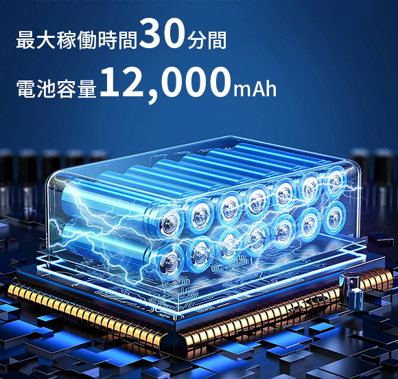 ・12,000mAhの大容量電池搭載、最大稼働時間は30分!