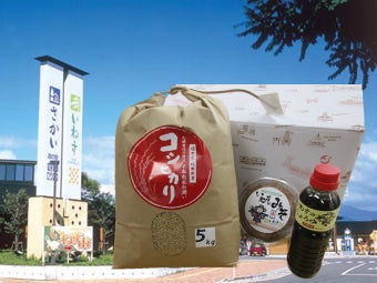 道の駅さかい(坂井地域交流センターいねす)で販売しているお米、味噌、醤油のセットです。