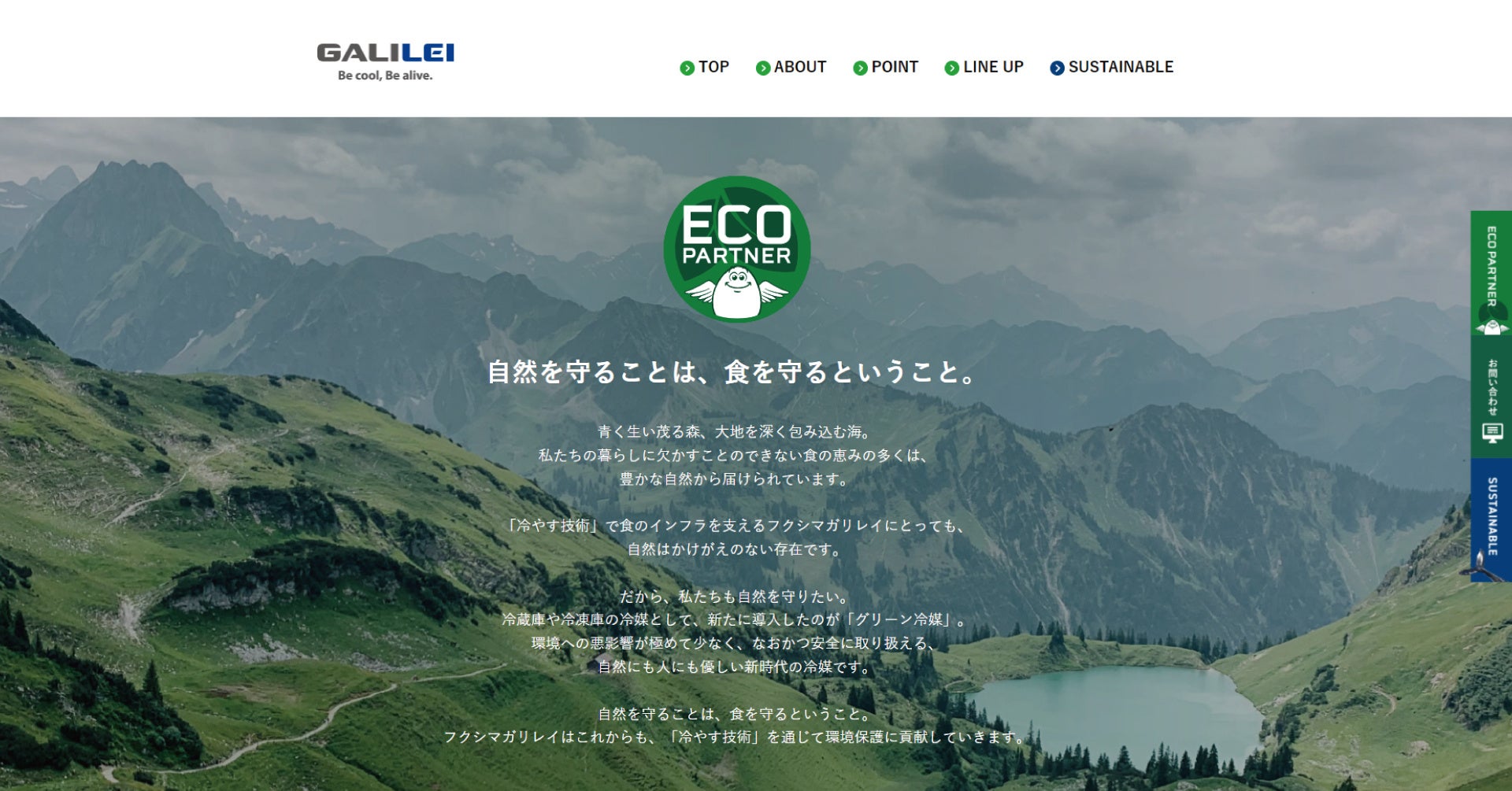 冷蔵庫や冷凍庫の冷媒として、新たに導入した「グリーン冷媒R1234yf」は、環境への影響が極めて少なく、かつ安全に取り扱える、自然にも人にも優しい新時代の冷媒です。自然を守ることは、食を守るということ。フクシマガリレイはこれからも、「冷やす技術」を通じて環境保護に貢献していきます。