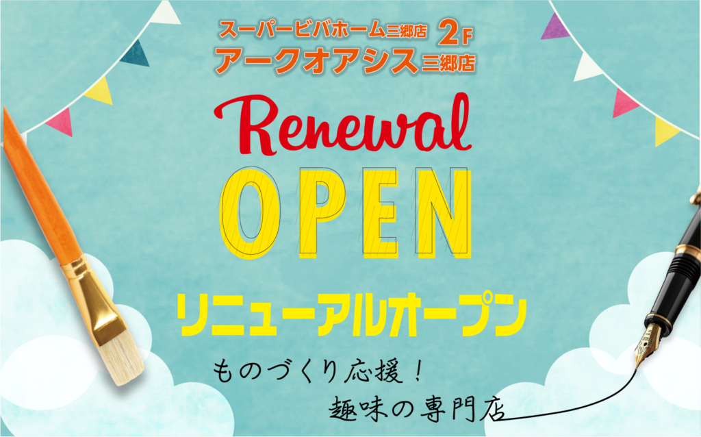 アークオアシス三郷店は、絵画、コミックイラスト、書道などの画材用品、ビーズ、手芸、レザークラフトなどのクラフト用品、輸入食品やコスメ、ステーショナリーなど流行とエンジョイをテーマにした趣味の商材を幅広く扱っております。日常の暮らしをより豊かに楽しくする商品とサービスの提供に努め、お客様に合ったすてきな時間の過ごし方を提案いたします。スーパービバホーム三郷店の2階で運営する当該店舗は、売場全体をパワーアップして約5,000アイテムを追加し、リニューアルオープンいたしました。