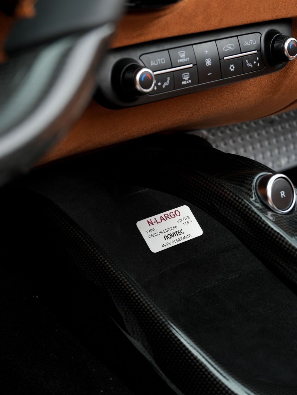今回のフルカーボンエディションのセンターコンソールには、N-LARGO『1of1』のオフィシャルプレートが輝く。