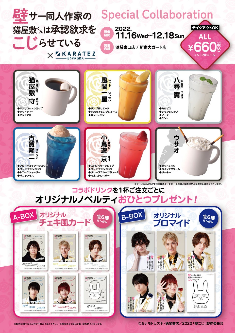 コラボ開催全店では、ドラマ『壁こじ』に登場する人物をイメージしたコラボドリンクを販売します。ノベルティはカラオケの鉄人とのコラボ仕様です。
