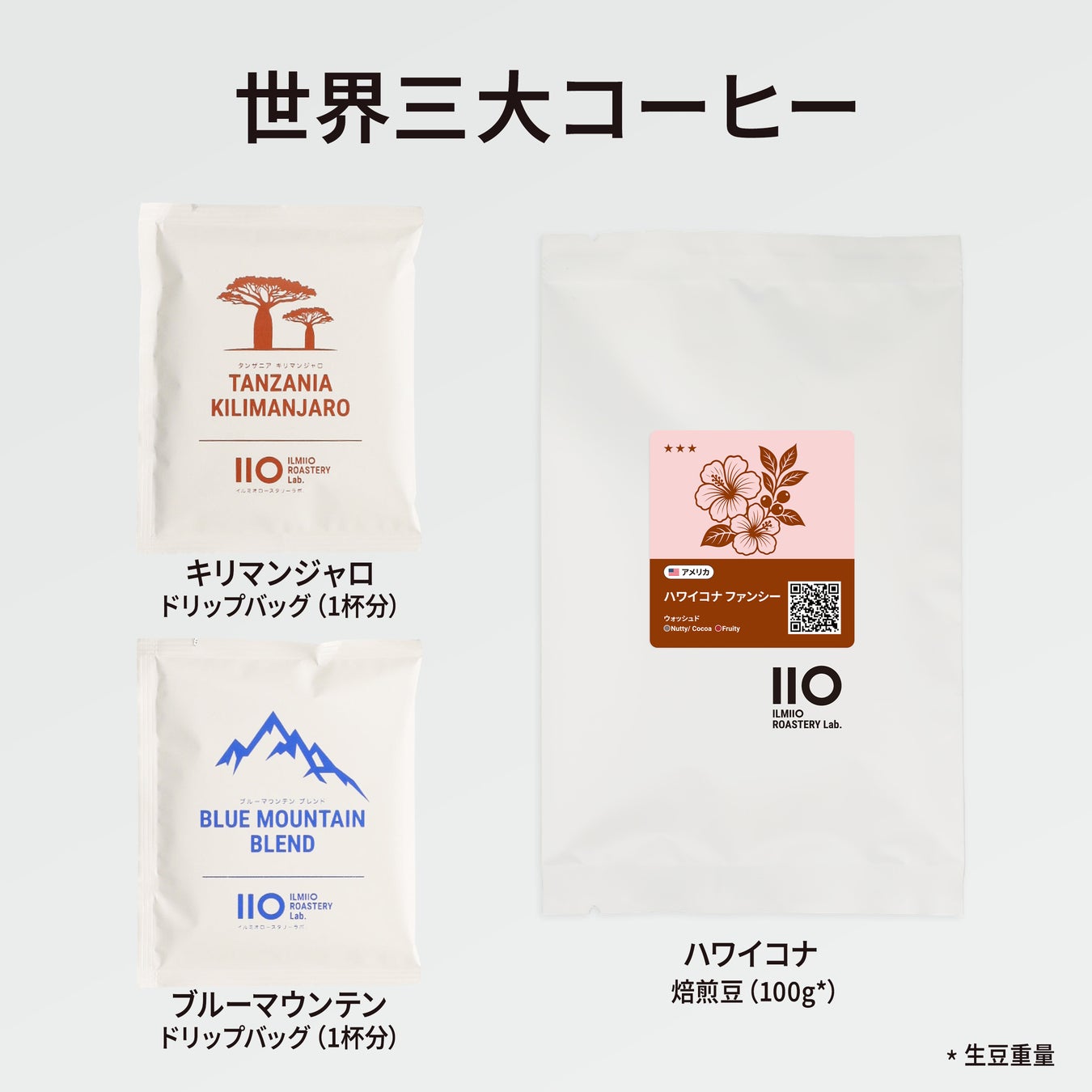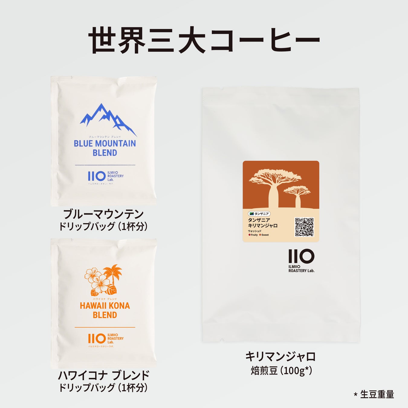 ハワイコナNo.1、ブルーマウンテンNo.1、タンザニア キリマンジャロの中から1種類をお選びいただけます。