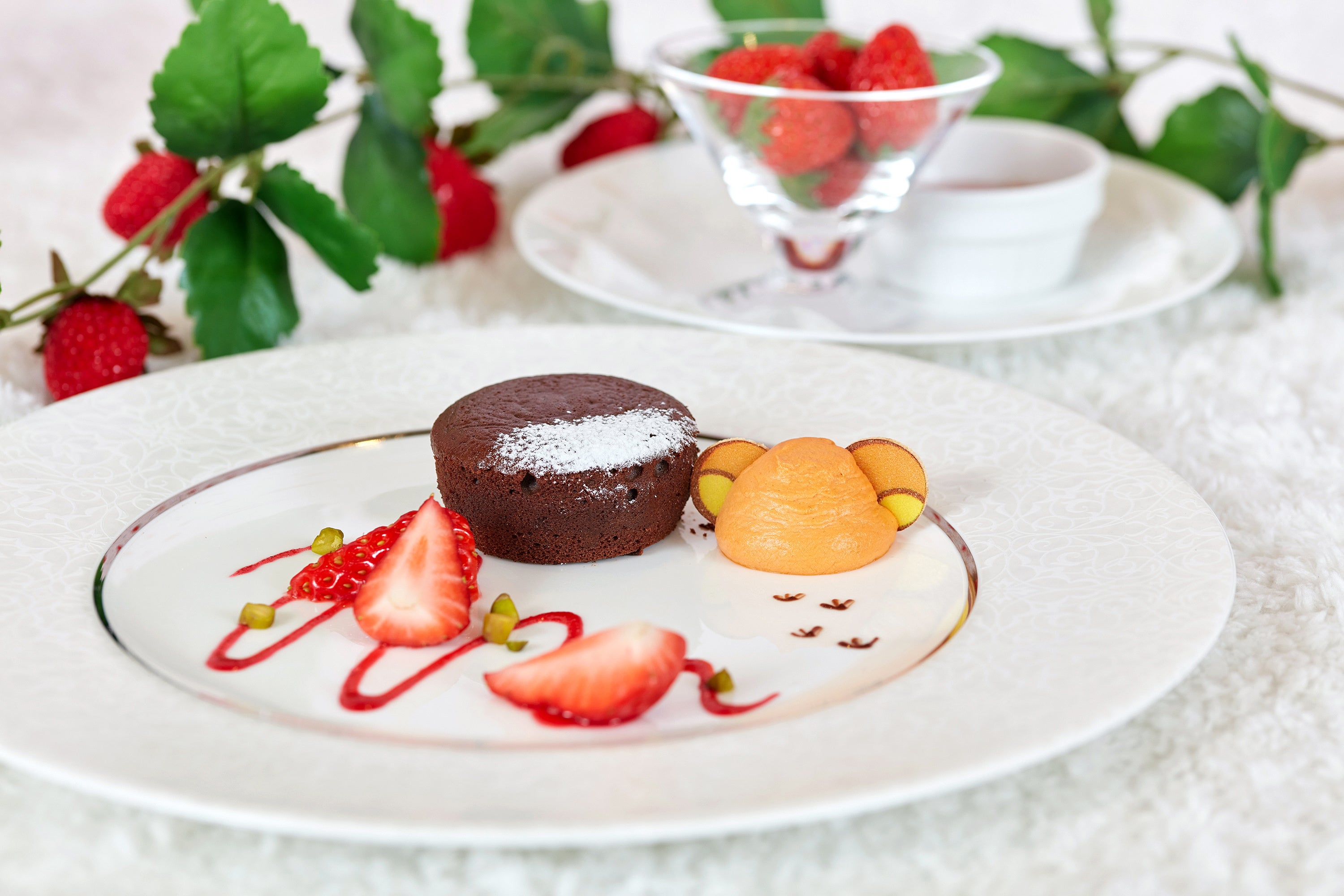 毎年人気のタルトなど、いちごをふんだんに使ったスイーツに加えて、リラックマが好きなプリンやホットケーキなど、パティシエが特別にアレンジしたスイーツをご用意!リラックマの仲間であるコリラックマやキイロイトリをモチーフにしたタルトレット、チャイロイコグマの胸毛をモチーフにしたクッキーサンドなど、食べるのがもったいなくなるかわいさです。また、最初にご提供するデザートプレートは、リラックマと仲間たちそれぞれをイメージした華やかなフォンダンショコラで、始まりの気分を盛り上げます。