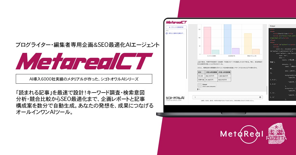 業種特化の専門AI開発・運営を行う株式会社メタリアル(本社:東京都千代田区、代表取締役:五石順一)は、ブログ記事企画・SEO最適化レポート作成AIエージェントとして、「Metareal コンテンツ」(以下、Metareal CT)を5月23日(金)に新開発・提供開始したことを発表します。