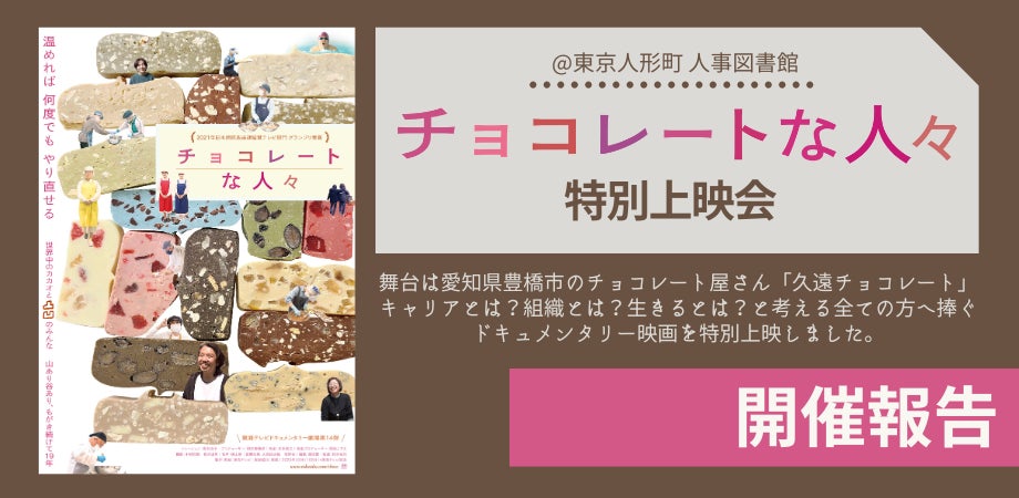東京・人形町のコワーキング×コミュニティスペース「人事図書館」で2025年1月26日、『チョコレートな人々』の特別上映会が開催されました。本作品は、心や体に障がいのある方、引きこもり、LGBTQ、子育て中のシングルマザーなどが働く、愛知県豊橋市のチョコレートブランド「久遠チョコレート」を舞台にしたドキュメンタリー。設立から19年。それぞれが試行錯誤の末、ユニークなアイデアを持ち寄って生み出されるカラフルなチョコレートは現在、全国52拠点で販売されています。本リリースでは、上映会の様子や参加者の声をお届けします。
