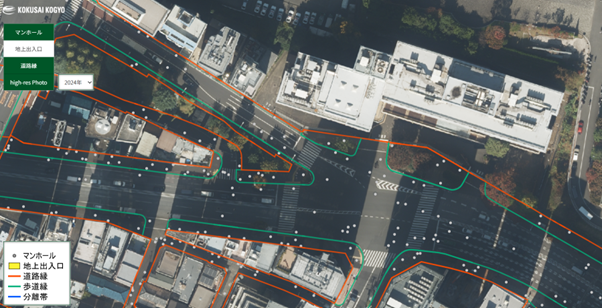 本サービスは、当社の地上解像度5㎝の航空写真データに加え、NTTインフラネット株式会社(本社:東京都中央区、代表取締役社長:上原 一郎、以下「NTTインフラネット」)の「高精度3D空間情報」との連携機能を実装しています。これにより、高解像度な航空写真と正確なインフラ位置情報をワンストップで取得できるWeb APIとして、都市部におけるスマートフォンLiDAR測量の精度補正や簡易測量の現場作業効率化など、社会インフラ管理の高度化を強力に支援します。