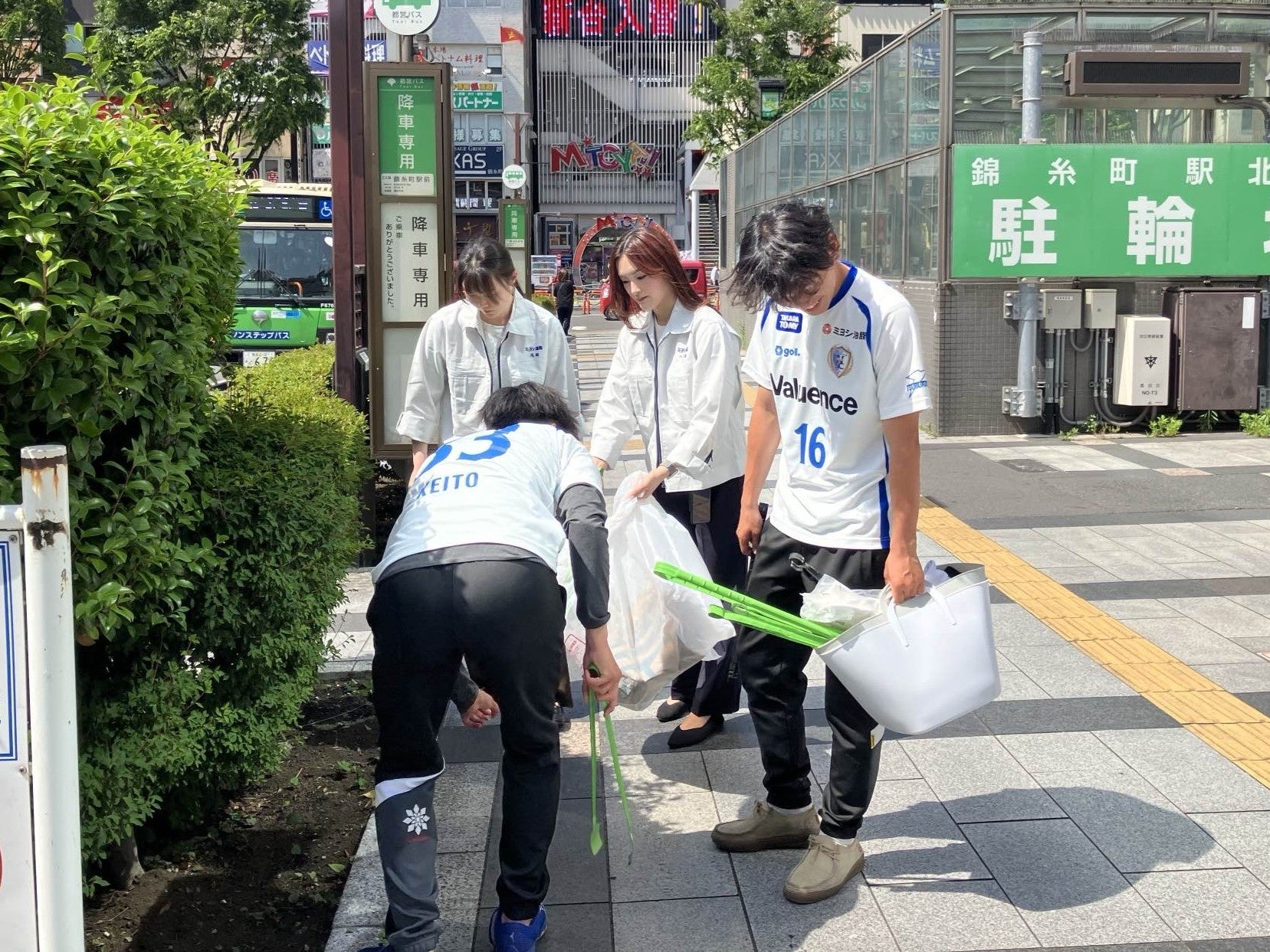ミヨシ油脂株式会社(本社:東京都墨田区、代表取締役社長兼CEO:三木逸郎)は、株式会社南葛SC(本社:東京都葛飾区、代表取締役:高橋陽一)と共同で、ミヨシ油脂本社がある墨田区の環境改善の取り組みを開始しました。今回は5月20日(火)に墨田区錦糸町駅周辺の清掃を、南葛SC所属選手とミヨシ油脂社員あわせて8名で実施。道端の空き缶や、ペットボトル、たばこの吸い殻、傘など、約1時間で2袋分のゴミを回収しました。ひきつづきミヨシ油脂と南葛SCは、墨田区や両社の地元葛飾区の環境改善に取り組んでいきます。