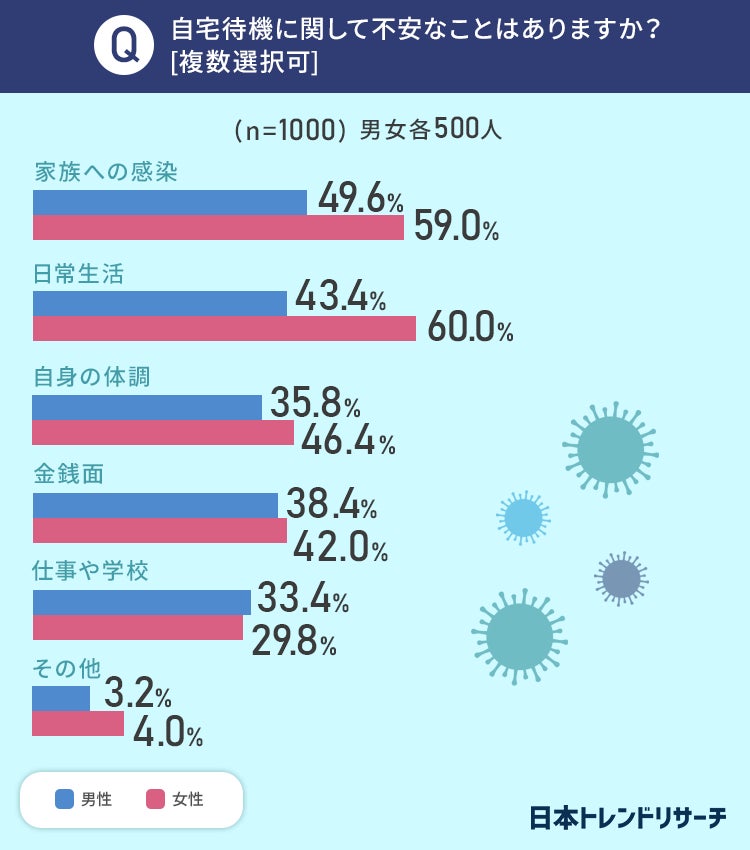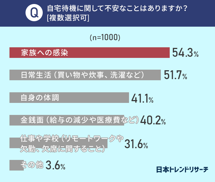 自宅待機について不安なことについて聞いたところ、半数以上の方が「家族への感染」「日常生活(買い物や炊事、洗濯など)」を回答しました。