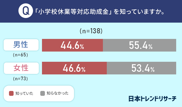 小学生以下の子どもが「いる」と回答した138名の方に「小学校休業等対応助成金」を知っているか聞きました。