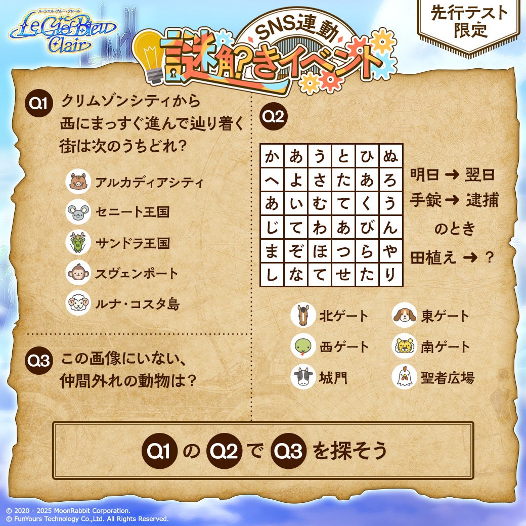 株式会社ムーンラビットは、PC向けオンラインゲーム『Le Ciel Bleu Clair~ル・シエル・ブルー・クレール~』にて、事前登録をされていない方も参加できるよう、先行テストの参加枠を拡大したことをお知らせいたします。また2月21日(金)より先行テストとSNSを連動させた謎解きイベントを開催いたしました。