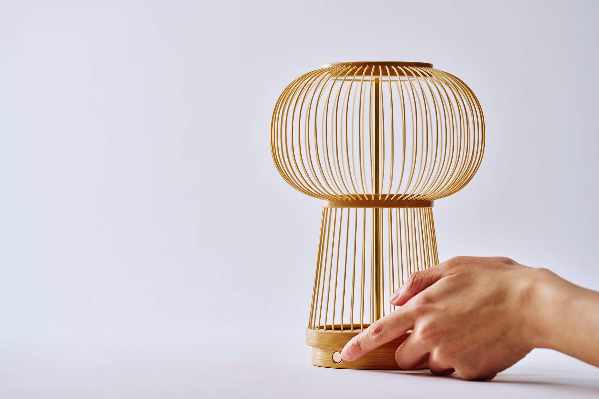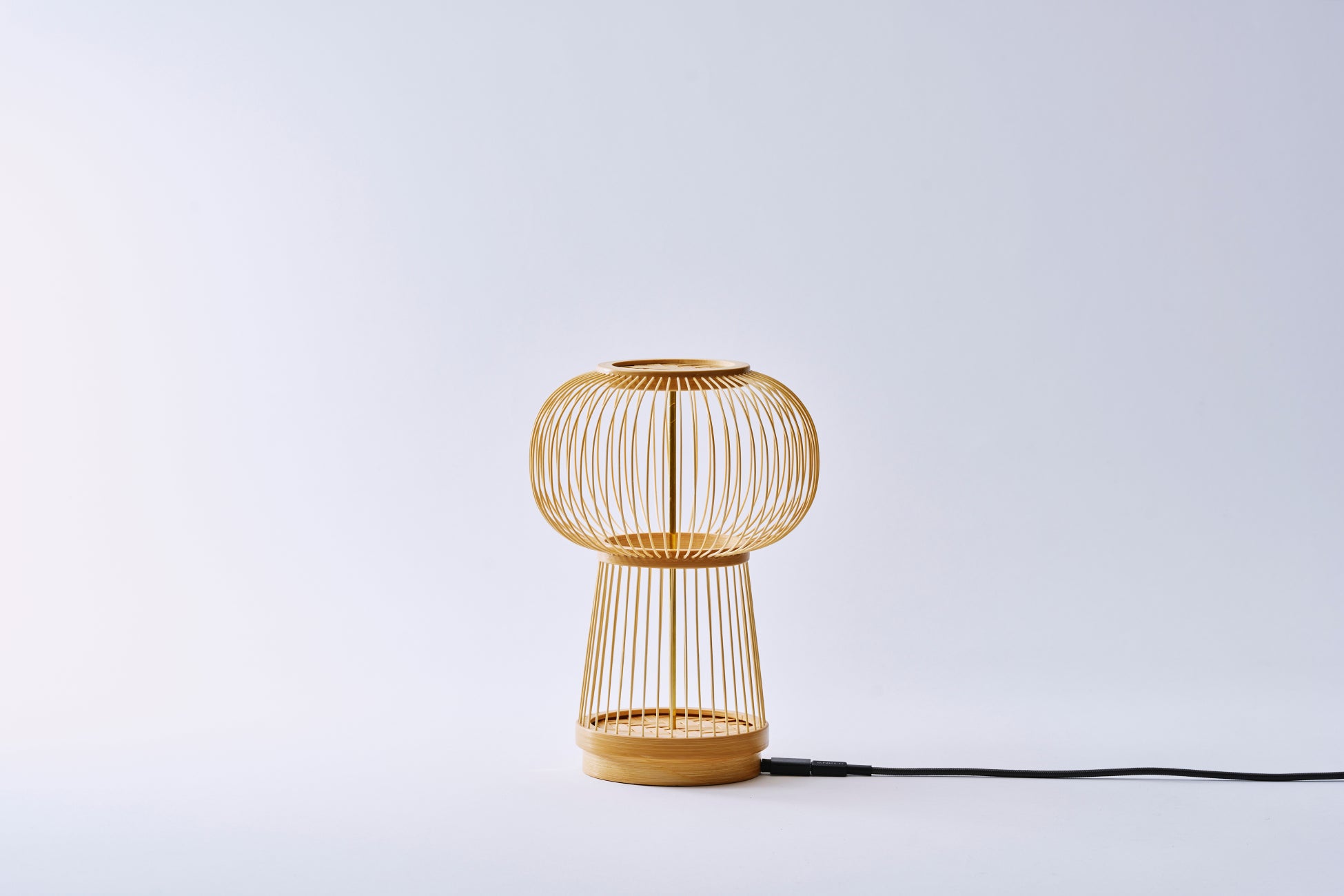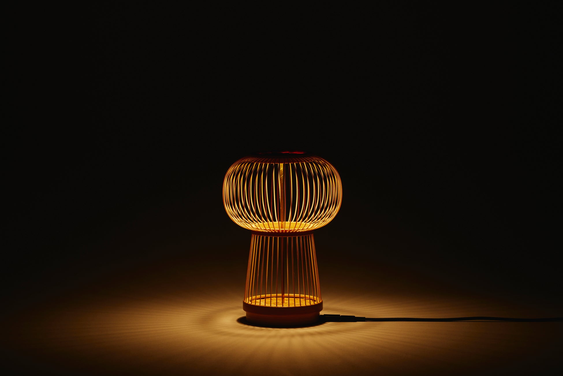 今回の開発では、駿河竹千筋細工がこれまで手がけてきた花器や虫かごといった「入れもの」から、「光の入れもの」であるテーブルランプへの変容を試みました。空(から)の入れものには、見えない光源から竹ひごに反射した、美しい「光溜まり」が現れます。空間には、光と影の対比による柔らかな放射状の光が広がり、静かな温もりを醸し出します。本品は非常に軽量で扱いやすく、優しい肌触りと伝統技法を活かした、現代のライフスタイルに調和する工芸品です。