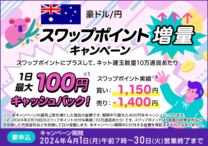 ※スワップポイント付与日ベースで最大10万通貨まで、 期間中で最大3,400円をキャッシュバック