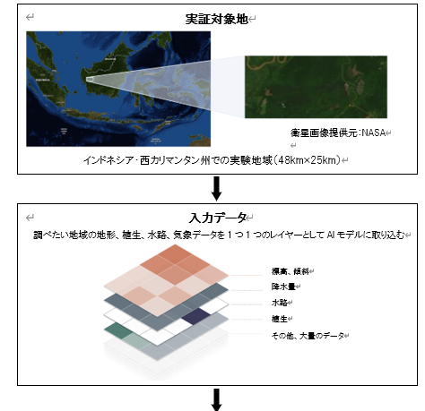 土地の標高や傾斜などの地形データ、降水量、水路などの情報をAIモデルにインプット