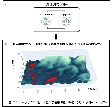 地下水位データを教師データとして、AIによる機械学習と物理モデルを複合したAI水理モデルが数日後の地下水位を予測