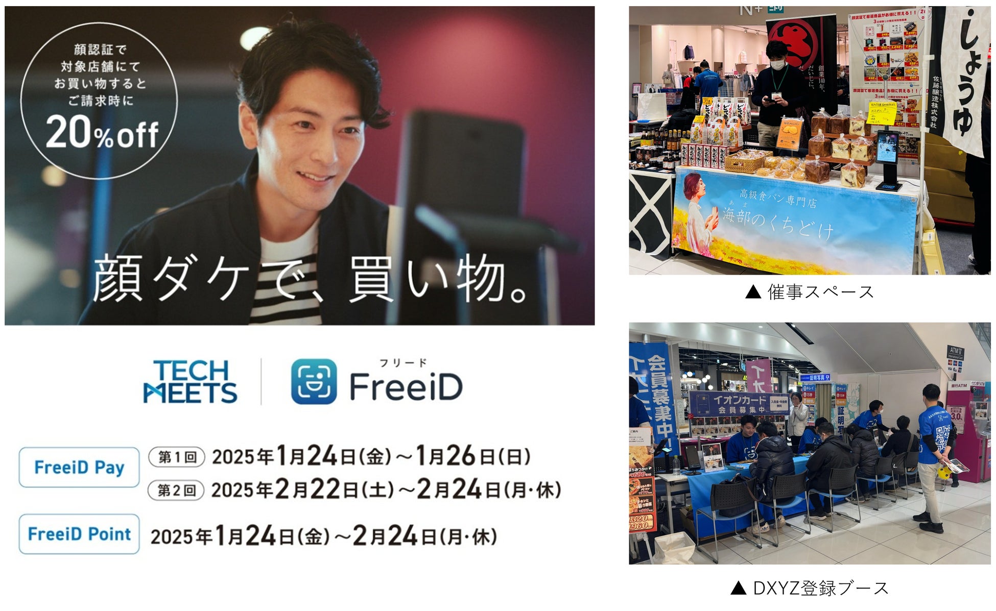 DXYZ株式会社(本社:東京都新宿区、取締役社長:木村 晋太郎、以下DXYZ)は、愛知県のあいちデジタルアイランドプロジェクト「TECH MEETS」※1で採択され、イオンモール常滑において2025年1月24日~26日、2月22日~24日の6日間に、顔認証決済サービス「FreeiD Pay」を提供し、346名の方にご利用いただき、決済回数は1,173回、決済金額は約350万円という結果となりましたので、お知らせいたします。