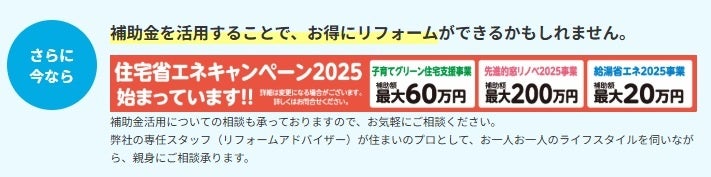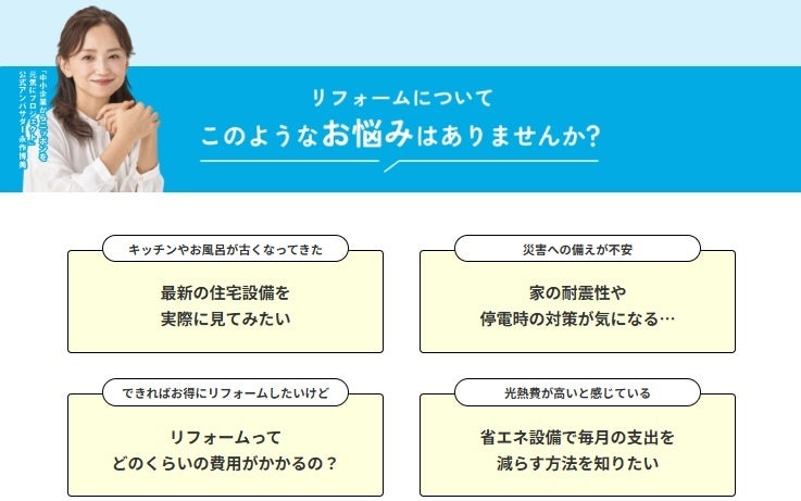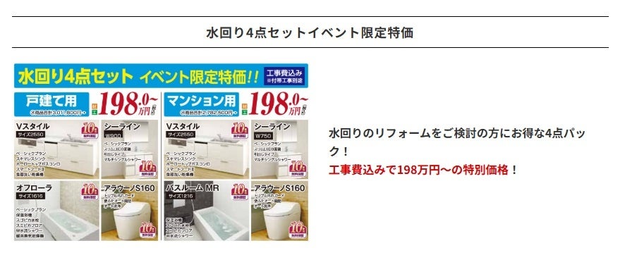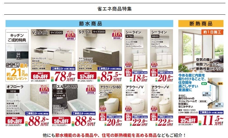 ・防災商品特集 太陽光パネル設置キャンペーンや蓄電システムなどの特価販売 ・省エネ商品特集 節水や断熱性に優れた商品をイベント限定価格でご案内いたします ・【工事費込!】水回り4点セット取り換えキャンペーン キッチン・バス・洗面・トイレをイベント限定価格でご案内いたします |