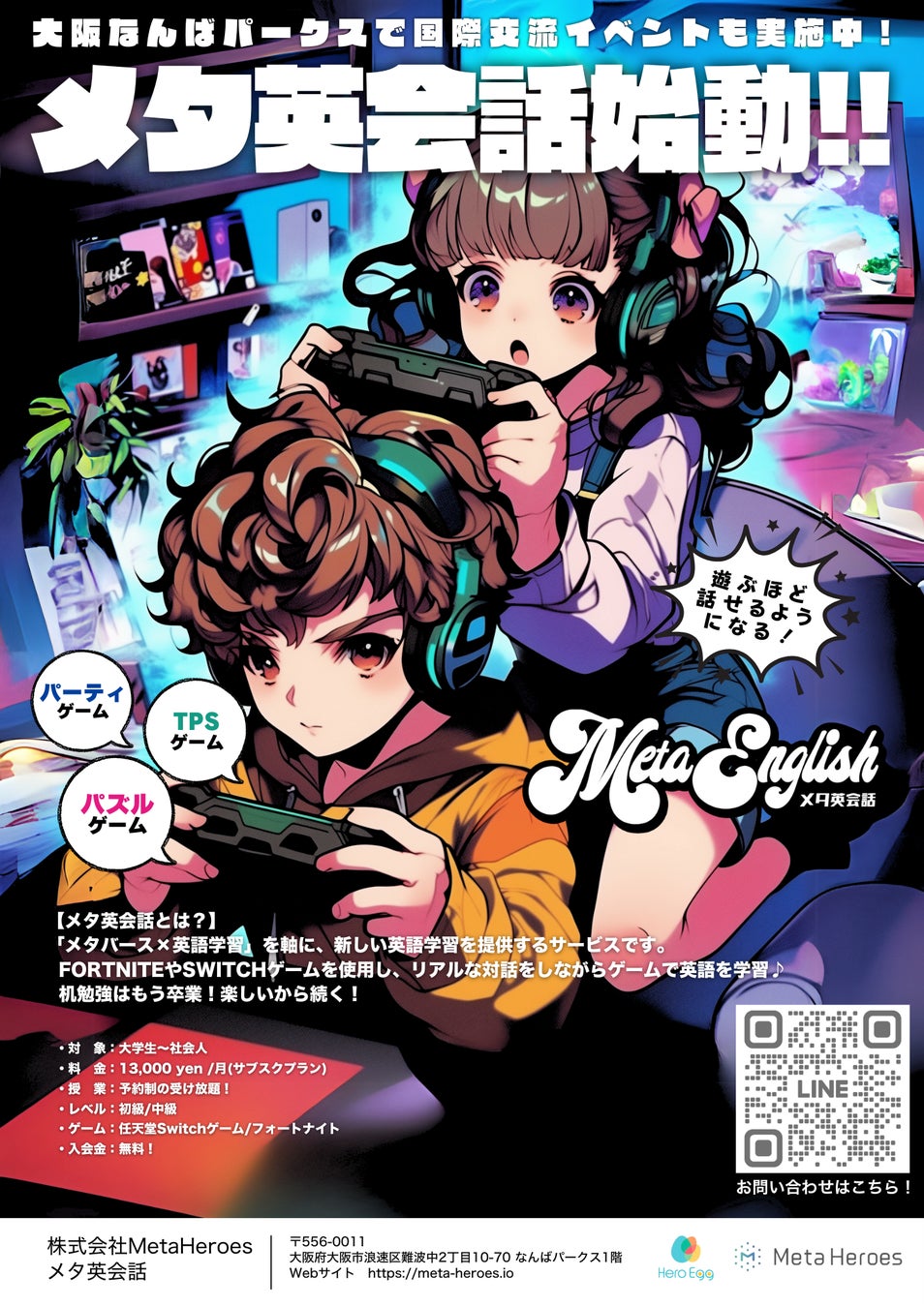 株式会社Meta Heroes(本社所在地:大阪府大阪市、代表取締役:松石和俊、以下:「当社」)は、英会話学習の新しい形として、メタバース空間内で英語を学べる新サービス「メタ英会話」を2025年4月15日に正式ローンチいたします。