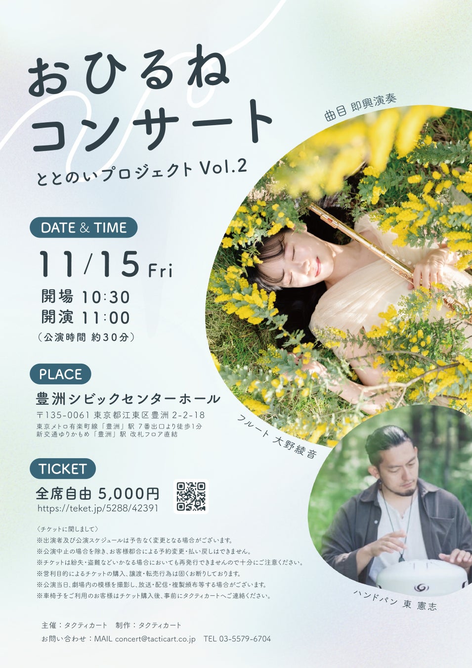 音楽療法士としても活動するフルート奏者の大野綾音、ハンドパン奏者の東憲志が、即興演奏を通じて自然の音に包まれるような" 癒し "の音楽体験をお届けします。公演時間は約30分と、0歳からの小さなお子様から大人の方まで、気軽に楽しんでいただける内容です。