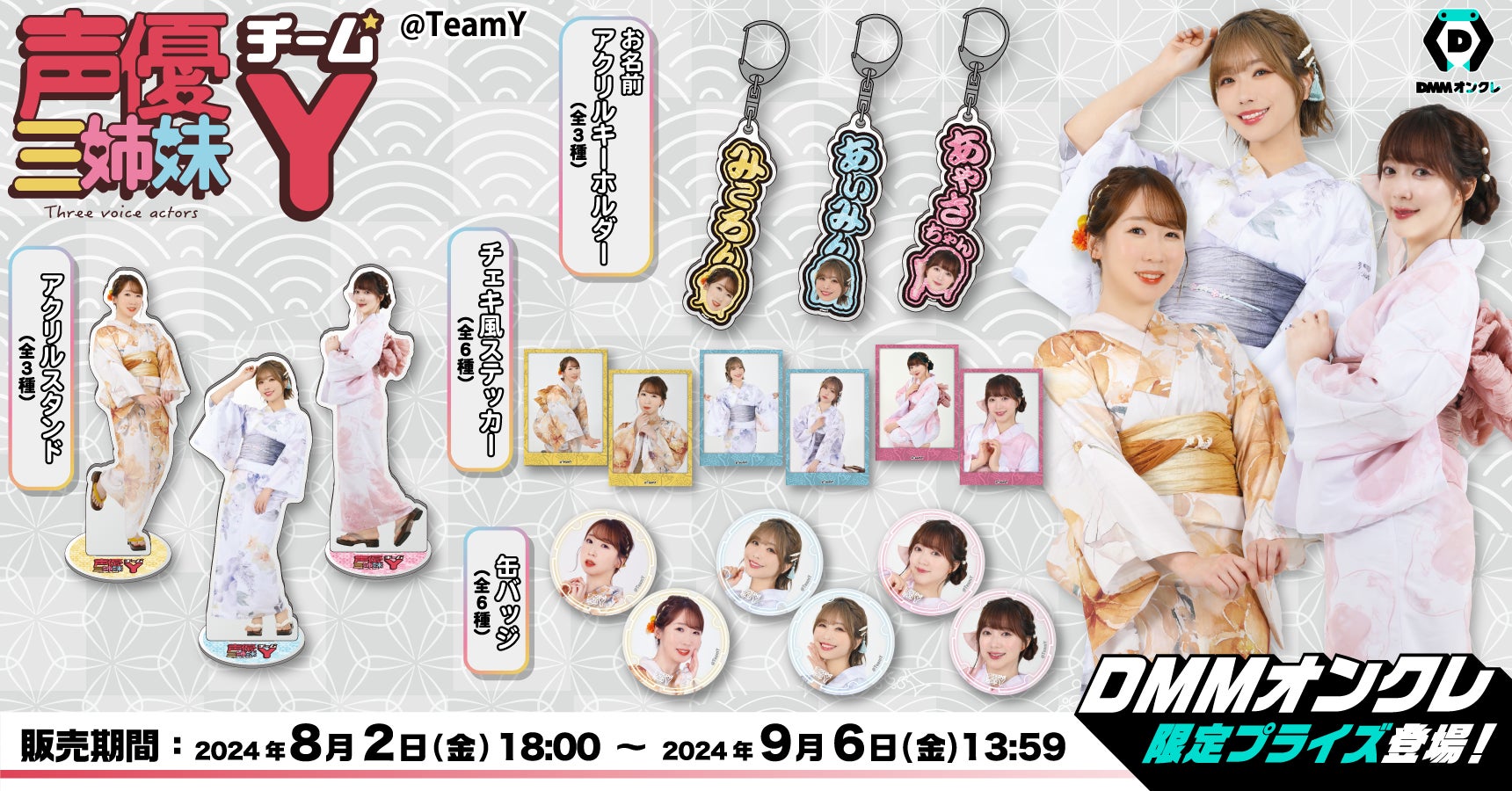 「DMMオンクレ」は、声優の佐々木未来さん、愛美さん、伊藤彩沙さんによるユニット「声優三姉妹【チームY】」の撮り下ろしオリジナルグッズを展開いたします。浴衣姿で撮影したアクリルスタンドや缶バッジなど、ここでしか手に入らない限定グッズとなっております。