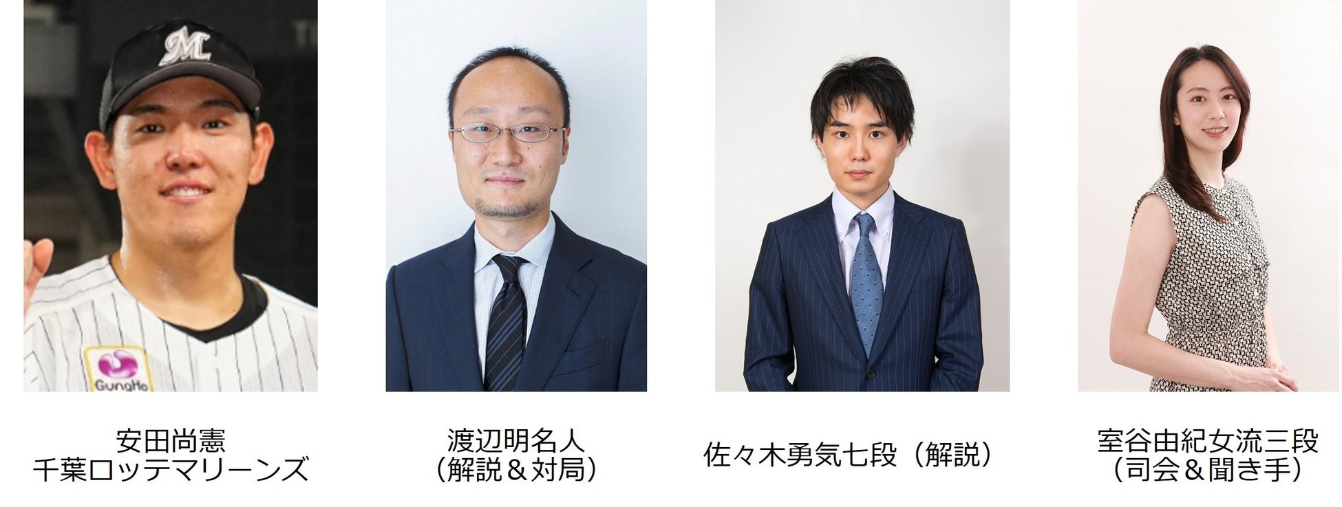 球界からは、日本プロ野球選手会の全面協力のもと、巨人・丸佳浩外野手、ソフトバンク・嶺井博希捕手、楽天・西口直人投手、日本ハム・齋藤友貴哉投手、ロッテ・安田尚憲内野手の5選手が参戦。また、将棋界からは、熱狂的なヤクルトファンで知られる渡辺明名人、佐々木勇気七段、阪神ファンの室谷由紀女流三段が出演し、プロ野球選手らによる盤上の熱い戦いを解説します。