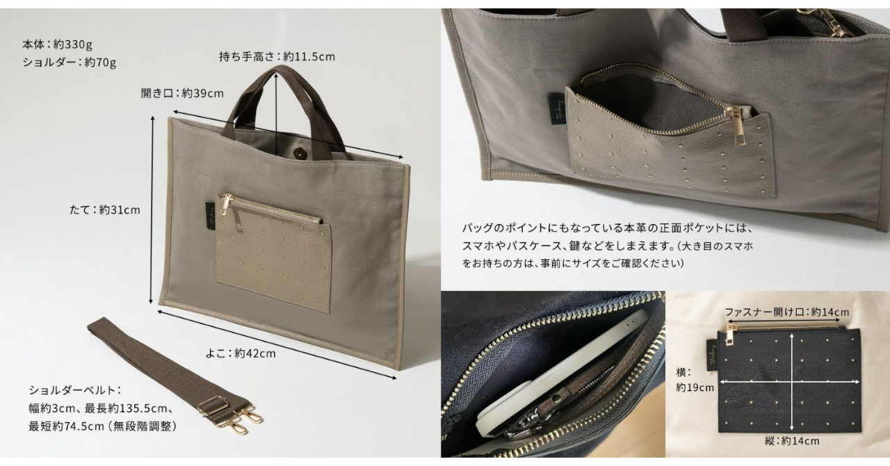 └ショルダー:紐幅3cm、最長135.5cm、最短74.5cm(無段階調整)