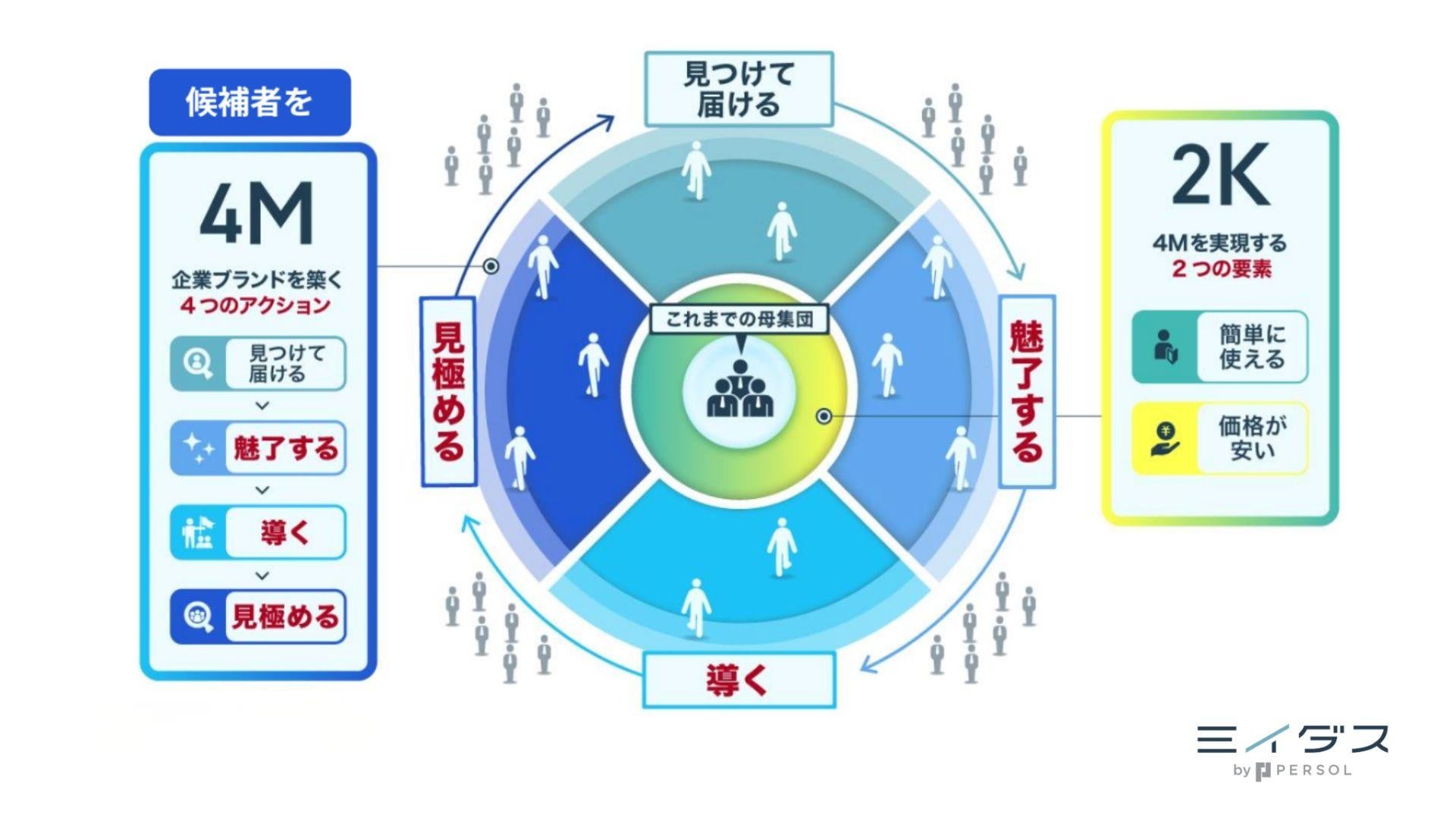 ※2:「4M2K」フレームワークとは、採用に特化し、企業ブランドを導く4つのアクション「見つけて・届ける」「魅了する」「導く」「見極める」とアクションを実現する2つの要素「簡単に使える」「価格が安い」をフルサポートする独自の採用サービスを指す