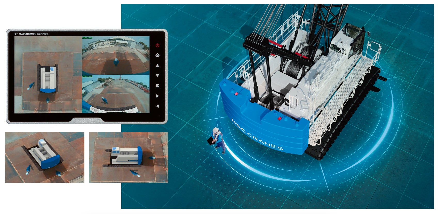 今回のマイナーチェンジでは、作業に関わる人を大切に守る、きめ細かな安全への配慮として、視認性を高めたタッチ式大型ディスプレイの採用と、情報量を拡充した新型過負荷防止装置(M/L)を搭載したほか、自閉式ゲートバーを採用したハンドレール付キャットウォークや、機械周囲の安全確認をサポートする周囲監視システム 「ARGUS🄬(アルゴス)」を設定するなど、クレーン本体周りへのアクセス性と作業の安全性を向上させました。