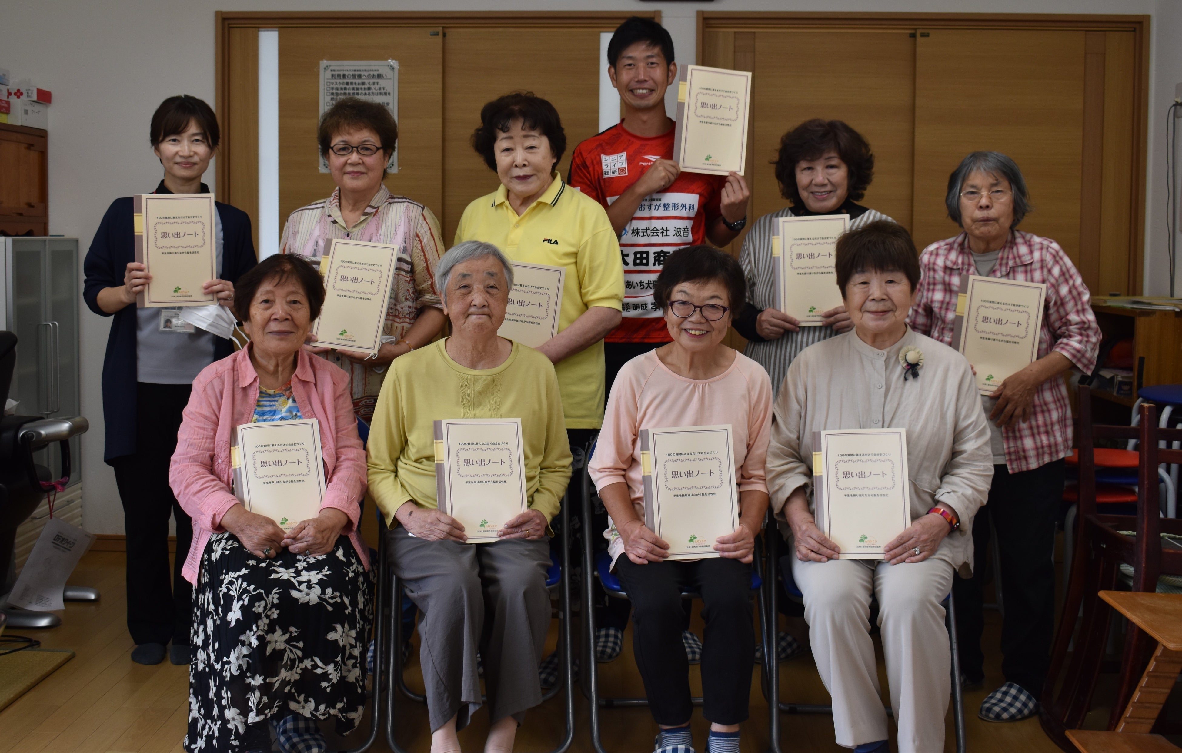 最後にはトーテックアメニティ株式会社よりご協賛いただいた『思い出ノート』をお集まりいただいた皆さんと雁が音地域包括支援センターへ贈呈致しました。