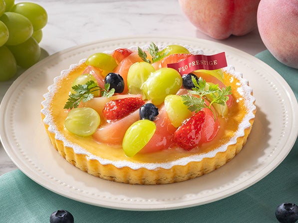 マイルドな酸味のチーズタルト台に白桃コンポート・シャインマスカット・苺・ブルーベリーを華やかに盛り付けました。