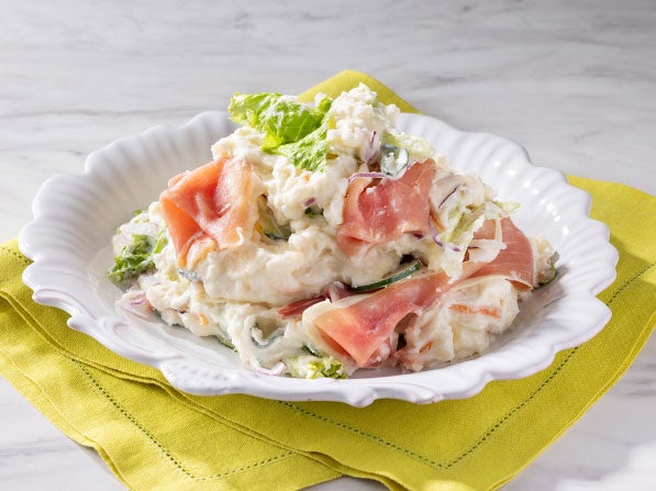 FLOの定番のポテトサラダにスペイン産の生ハム「ハモンセラーノ」を盛り合わせた、ちょっぴりリッチなサラダです。